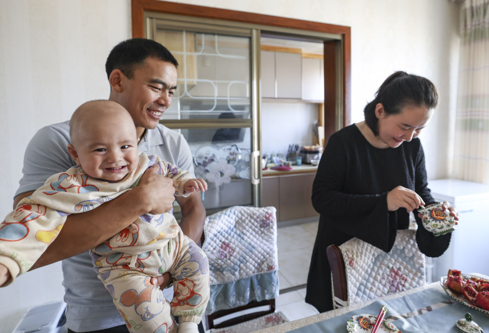 ↑2023年11月16日,在参加第十四届全国冬季运动会之前,吐尔松江·布尔力克回乌鲁木齐探亲,他抱着儿子,和妻子一起在家中。