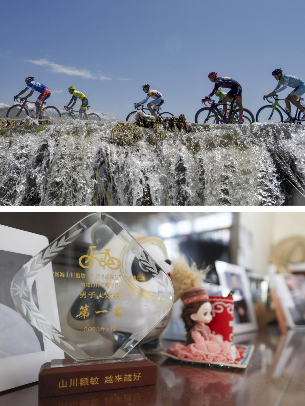 ↑拼版照片:上图为大学期间,吐尔松江·布尔力克(左一)在新疆巴音布克草原参加自行车比赛(2016年7月26日摄);下图为吐尔松江摆放在家中的2023年8月一次自行车赛的奖牌(2023年11月16日摄)。