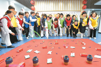 1月20日,江苏省扬州市邗江区方巷镇方家巷社区的老人们在社区养老服务中心参加“套圈”比赛。庄文斌摄(人民图片)