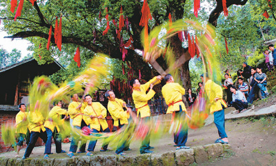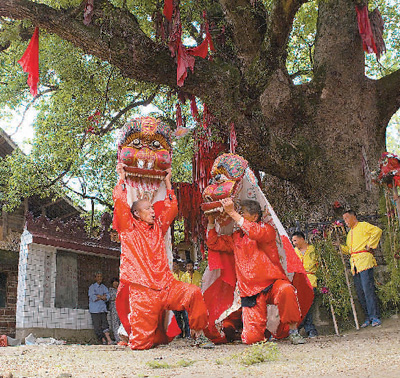 水车镇楼下村,民间艺人们在千年古樟树下表演傩狮舞。
