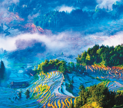 紫鹊界梯田分布在海拔500—1200米的山麓间,时常有云雾缭绕,宛若仙境。图为紫鹊界梯田春季的美景。