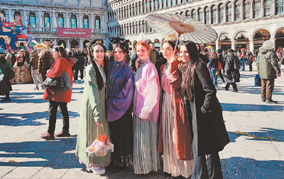 近日,在意大利威尼斯圣马可广场上,中意两国青年向威尼斯市民和来自世界各地的游客展示了中国传统服饰。作为威尼斯狂欢节的一部分,由威尼斯大学孔子学院与中国苏州丝绸博物馆举行的汉服巡游活动就此拉开帷幕。