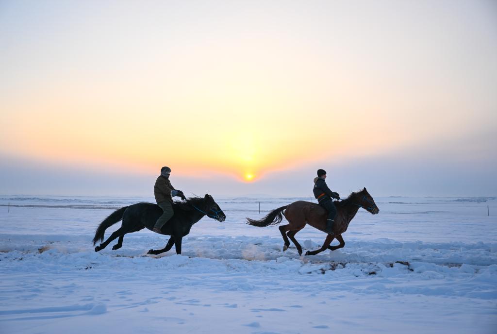2023年12月15日,陈巴尔虎旗牧民乃日嘎(右)和伊吉力在草原上骑马训练。新华社记者 贝赫 摄