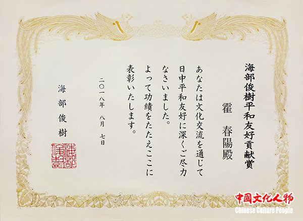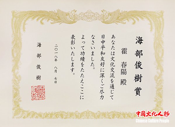 日本前首相海部俊树授予霍春阳“海部俊树和平友好贡献奖”,霍春阳教授成为国内首个获此殊荣的艺术家