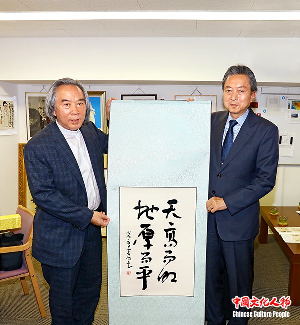 霍春阳向日本前首相鸠山由纪夫赠送自己精心创作的《天高而明 地厚而平》,以此表达美好的祝愿