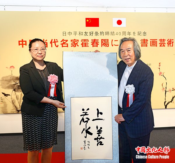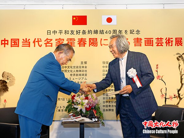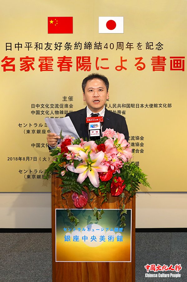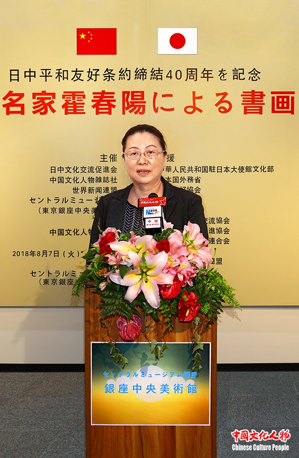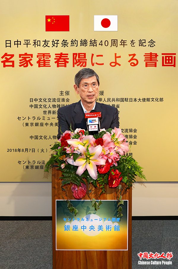 中国文化人物(主编 王保胜)为纪念中日和平友好条约缔结40周年,2018年8月7日,由日本国外务省、中华人民共和国驻日本大使馆文化部、日中友好议员联盟、日中友好协会、日中经济协会、日中友好会馆、日中文化交流协会、日本国际贸易促进协会、国际艺术家联盟、全日本书道联盟、全日本华侨华人联合会、中国书法学院、日本勝佳支持,日中文化交流促进会、中国文化人物杂志社、世界新闻联盟、东京银座中央美术馆主办,中国文化人物杂志社承办的“纪念中日和平友好条约缔结40周年——中国当代名家霍春阳书画艺术展”在日本东京银座中央美术馆隆重开幕。日本自民党副总裁高村正彦,中国驻日本大使馆大使代办郭燕,中国文化人物杂志社总监官景辉,日本前首相海部俊树秘书官松本彧彦,全日本华侨华人联合会名誉会长顔安,日本中国友好协会常务理事永田哲二,全日本华侨华人联合会会长刘洪友,中国文化人物杂志社社长王保胜,日本旧皇族、中国书法学院顾问葛城茂敬,日展审査员藤岛博文,东京银座中央美术馆馆长水野刚,中国驻日本大使馆文化部文化担当贺怡蓝,日中文化交流促进会副理事长罗华,日本勝佳株式会社代表取缔役黄佳,中国艺术研究院博士生导师、中国国家画院研究员、天津美术家协会副主席、天津美术学院美术馆馆长、著名花鸟画家霍春阳,以及来自中日两国社会各界的嘉宾150余人出席。