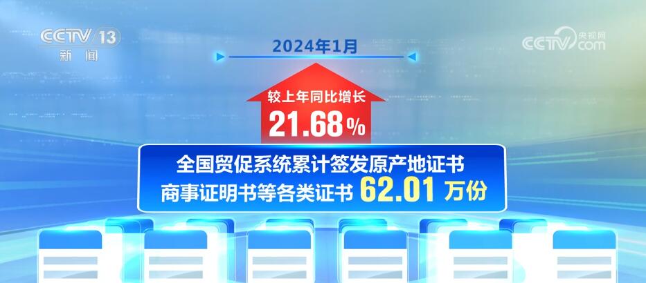 2024年1月,全国贸促系统累计签发原产地证书、商事证明书等各类证书62.01万份,较上年同比增长21.68%。其中,全国贸促系统非优惠原产地证书签证金额为325.48亿美元,同比增长9.12%;签证份数38.24万份,同比增长14.36%。