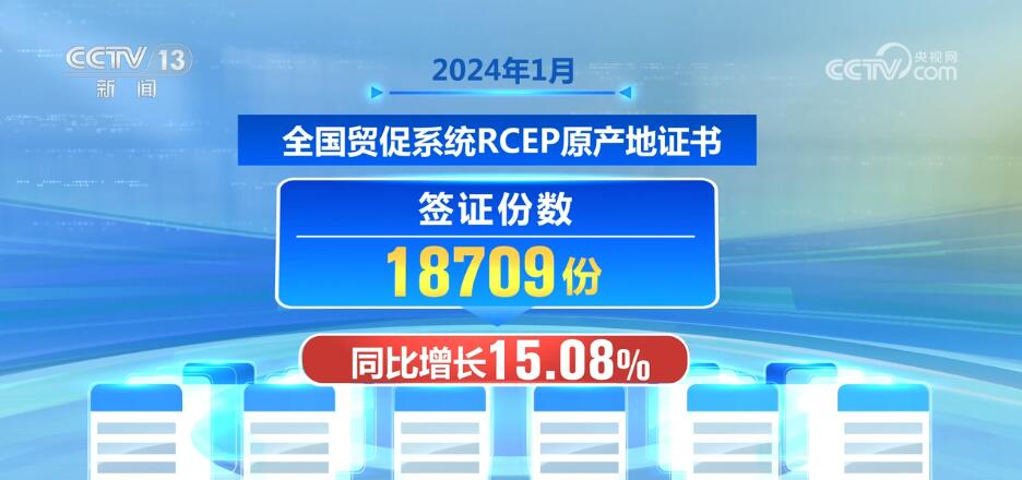 2024年1月,全国贸促系统RCEP原产地证书签证份数为18709份,同比增长15.08%;办证企业3640家,同比增长10.40%,出口目的国包括日本、印尼、韩国、越南等13个成员国,预计共为我国产品在RCEP进口成员国减免关税0.09亿美元,RCEP的政策红利在持续释放。