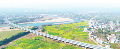 江西赣州市于都县车溪乡桃坑村,盛开的油菜花与民居、公路、河流等相映成趣,构成一幅春意盎然的美丽画卷。