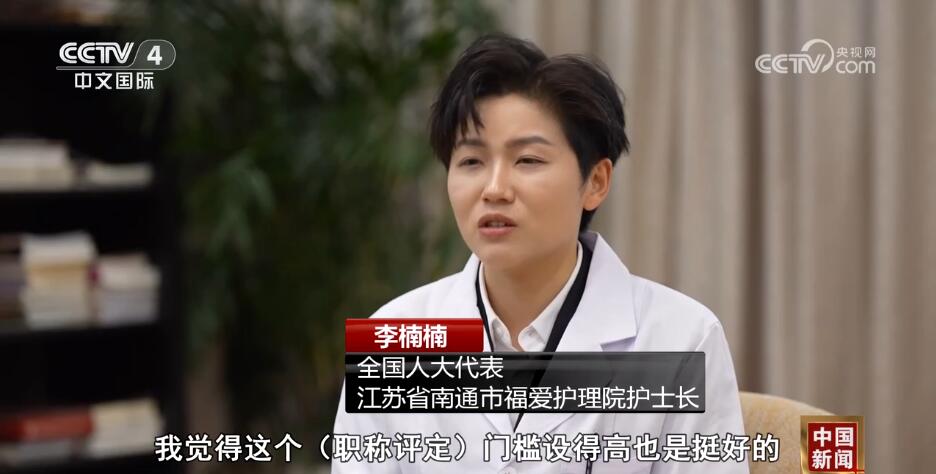 全国人大代表、江苏省南通市福爱护理院护士长李楠楠则表达出自己的意见:“我觉得职称评定门槛设得高也挺好,能够让大家觉得有这么样的一个行业,也需要这么高的门槛才可进去。这样,才能让在校生觉得选择这个行业并没有错。国家已经为养老行业专门设了一个职称,也希望大学生毕业以后能够真正地去扎根到养老行业。”