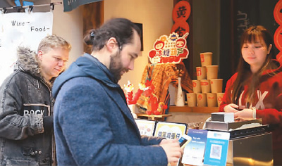 海外游客在杭州的小店用手机扫码结账。支付宝供图