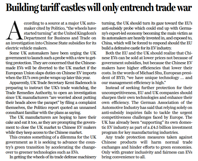 欧盟和英国车企本身缺乏竞争力,他们应该磨练技术、提升效率,而不是设法让自己的“保护伞”越撑越大。德国汽车工业协会曾表示,单靠反补贴调查,无助于解决欧洲自身缺乏竞争力等紧迫问题。英国方面也已经向关键制造业提供45亿英镑补贴,并由此为其电动汽车产业发展提供了“支持”。