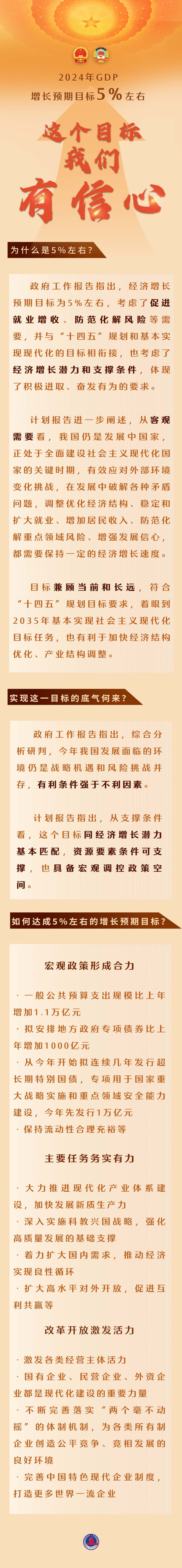 3月5日提请十四届全国人大二次会议审议的政府工作报告,提出2024年GDP增长预期目标为5%左右。为什么是5%左右?实现这一目标的底气何来?如何达成5%左右的增长预期目标?