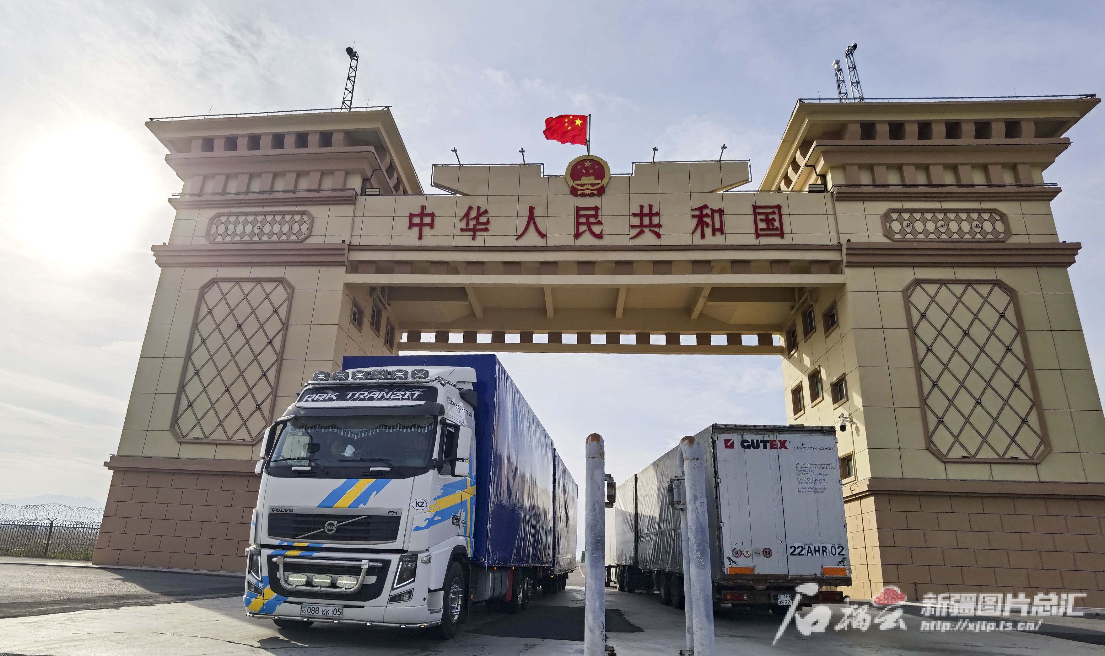 2023年11月10日,货车进出都拉塔口岸国门。天山网-新疆日报记者 汤永摄