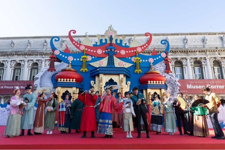 2月13日,在意大利威尼斯,志愿者身着汉服进行表演。(图源:新华社)