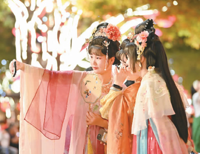 身着古装的游客在西安大唐不夜城游览拍照。新华社记者 宋为伟摄