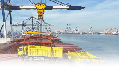 一批工程车辆在山东港口烟台港装入中非班轮,将发往几内亚马瑞巴亚港,投入当地基础设施建设。