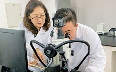 马晓燕(左)指导学生分析年轮宽度。本报记者 施 芳摄