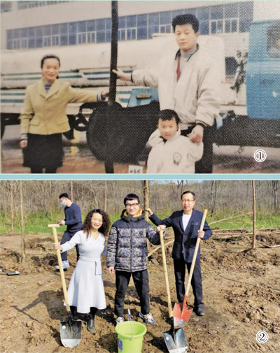 图①:1999年春,魏文芳(左一)和家人种下第一棵树时的合影。受访者供图