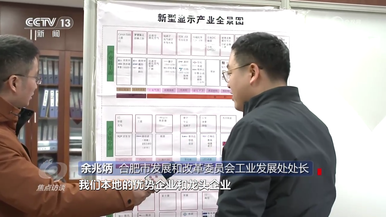 合肥市发展和改革委员会工业发展处处长余兆炳:“新型显示产业全景图上面显示了合肥市发展新型显示的产业链的上游、中游、下游本地的优势企业和龙头企业,有这个全景图,我们对标作战、挂图作战非常可视化作战。”
