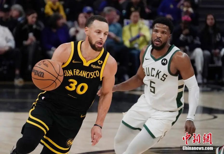 库里(左)在比赛中持球突破。资料图 中新社记者 刘关关 摄