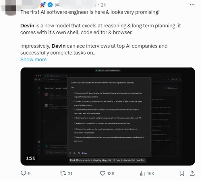 “第一位AI工程师看起来很有希望,令人印象深刻的是,Devin可以在顶级AI公司的面试中脱颖而出,并且成功地完成了任务。”有人工智能专家在社交平台分享观点。多个Devin编程的视频也在网络流传。