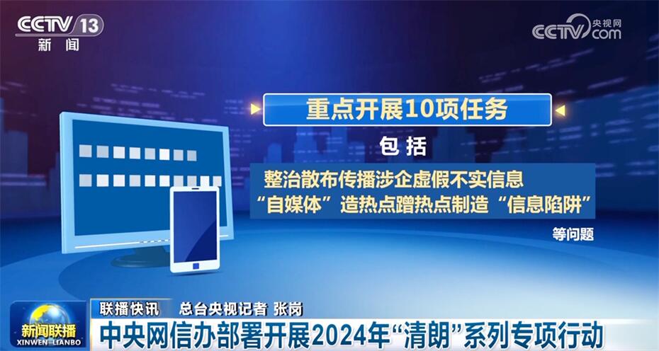 记者3月15日从中央网信办获悉,2024年“清朗”系列专项行动将重点开展10项任务,包括整治散布传播涉企虚假不实信息、“自媒体”造热点蹭热点制造“信息陷阱”等问题。