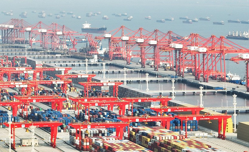 2月25日,江苏省太仓港集装箱码头桥吊林立,长江上货船往来穿梭,一派繁忙景象。(图/视觉中国)