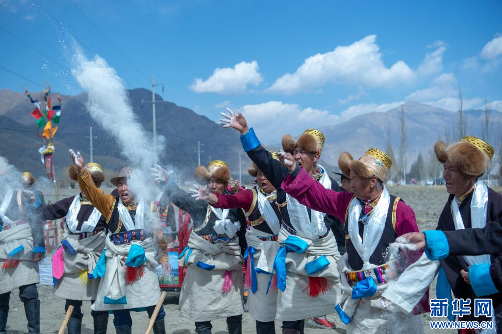 3月16日,克松社区居民在参加春耕仪式,播撒种子。新华网 旦增努布 摄