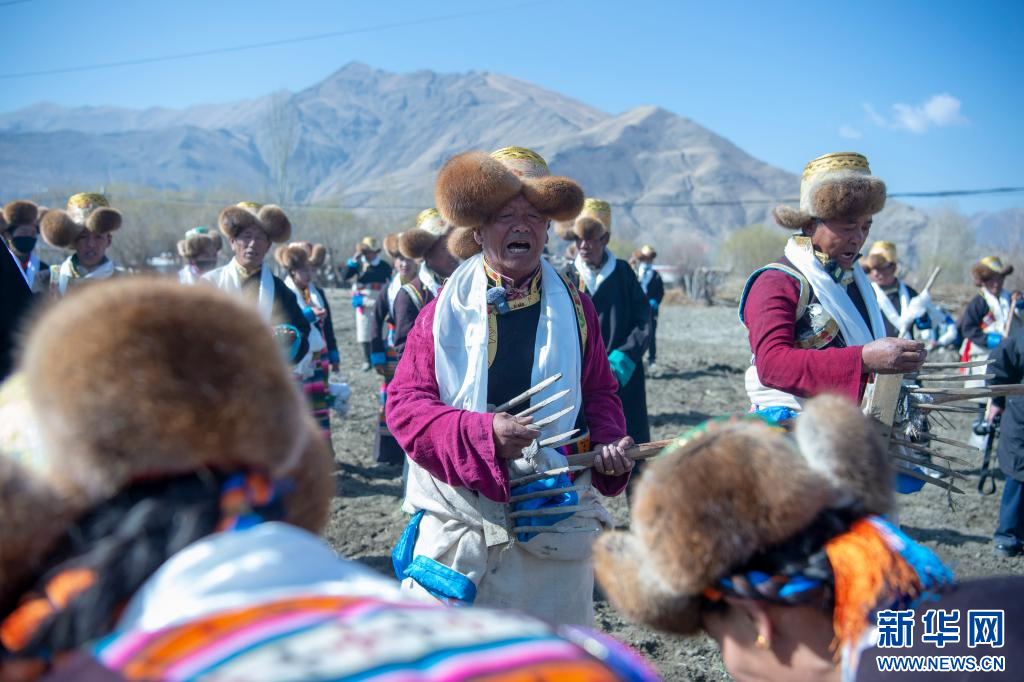 3月16日,克松社区居民格桑多吉在领唱古老的《春耕之歌》。新华网 旦增努布 摄