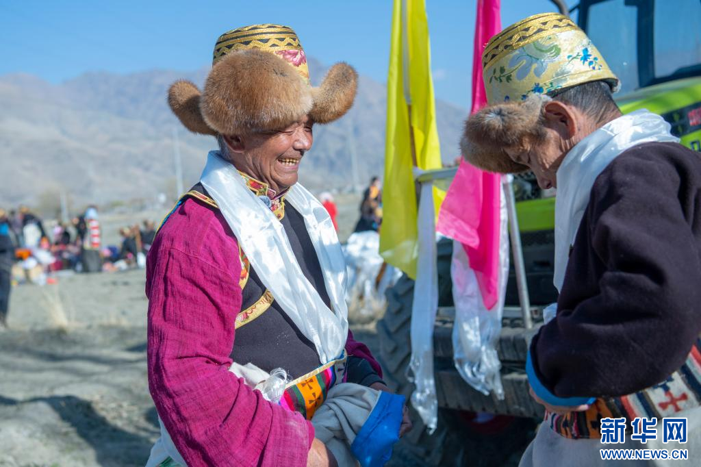 3月16日,克松社区居民格桑多吉(左)在参加春耕仪式。新华网 旦增努布 摄