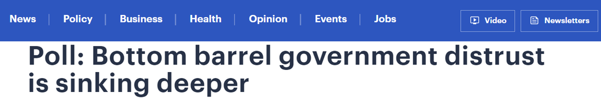 文章称,由于美国民众普遍对政府缺乏信心,对政府发布的信息也不信任。调查显示,大约三分之二(62%)的美国成年人认为政府在公共沟通方面效率低下,69%的人“非常”或“根本”不信任政府的信息。