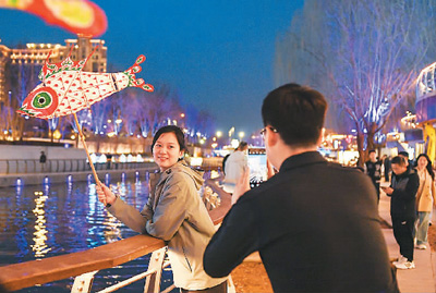 近年来,北京市朝阳区推动城市更新,打造了80万平方米的亮马河国际风情水岸,实现6公里航线通船,游船航线途经燕莎、蓝色港湾、红领巾公园等多处商圈、公园,已成为北京高质量发展的新亮点。图为3月16日晚,游客在亮马河畔观光休闲。新华社记者 鞠焕宗摄
