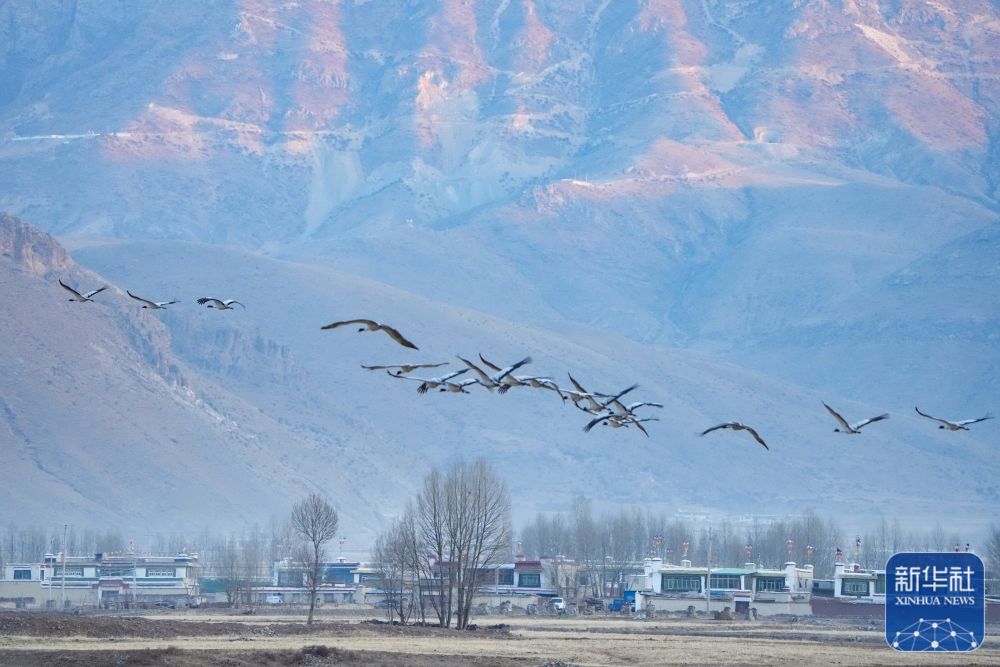 ↑这是在林周县虎头山水库附近村庄拍摄的黑颈鹤(3月17日摄)。新华社记者 晋美多吉 摄