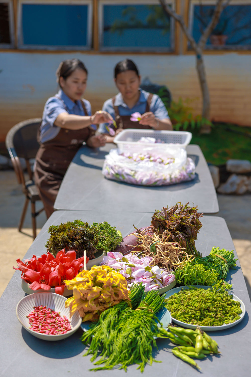 云南省南涧彝族自治县公郎镇凤岭村村民把无量山上的野生棠梨花采摘下来做成美食——棠梨花菜。 新华社发(适志宏 摄)
