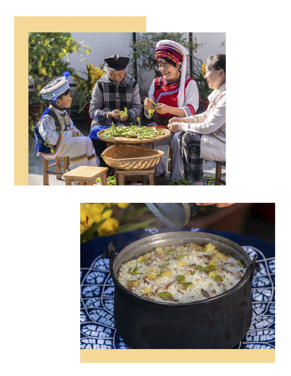 大理白族自治州洱源县茈碧湖镇碧云村村民剥青豆制作鲜豆焖饭。 新华社发(罗新才 摄)