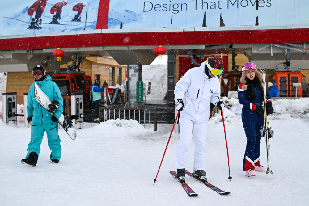 2024年3月8日,游客在位于禾木村的吉克普林国际滑雪度假区准备滑雪。新华社记者陈朔 摄
