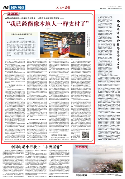 加快推动商户开通境外银行卡受理、进一步优化外币兑换服务、推动境外银行卡更方便地绑定微信或支付宝……近段时间以来,中国支付服务再升级,得到很多外国友人点赞:“一部手机走四方,在中国支付很‘丝滑’”“多种支付方式,让我在中国的生活工作变得更加便利”。