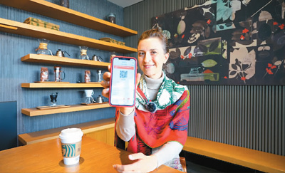 一名外籍人士在北京望京一家咖啡店内体验使用手机小程序预定公园门票。康 杰摄