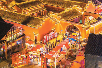 游客在浙江省宁波市城隍庙夜市赏夜景、品美食。胡学军摄(人民图片)
