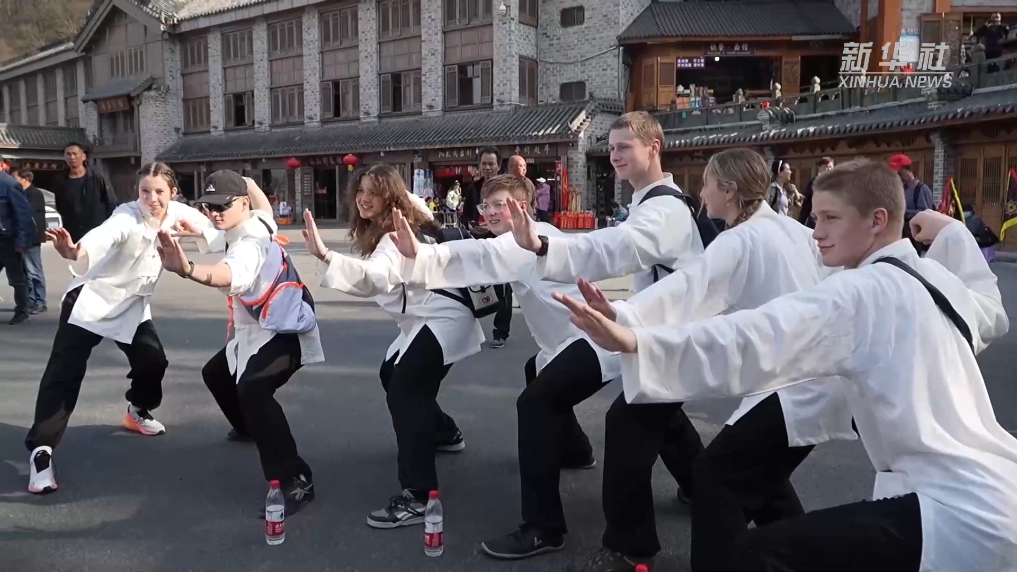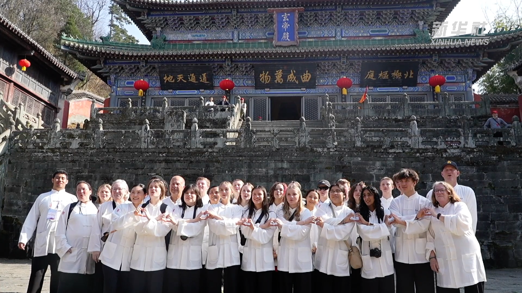 3月22日,美国华盛顿州中学生代表团抵达湖北十堰武当山。学生们身着练功服,徒步登上始建于元代的南岩宫,参观玄帝殿、天乙真庆宫。