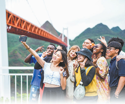 2023年6月3日,“邂逅中国”来华留学生社会实践活动在贵州举行。图为留学生实地参观坝陵河大桥时留影。