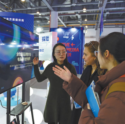 2023年11月24日,在全球数字贸易博览会上,外宾在“丝路电商日”活动中了解电商直播。