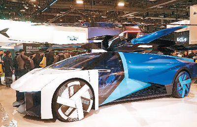 图为人们在展会现场参观中国企业小鹏的展区。