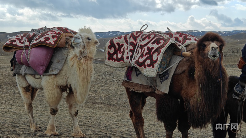 沙尔克提·哈依尔什骑马牵着骆驼转场 (央广网记者郭璁悦 摄)