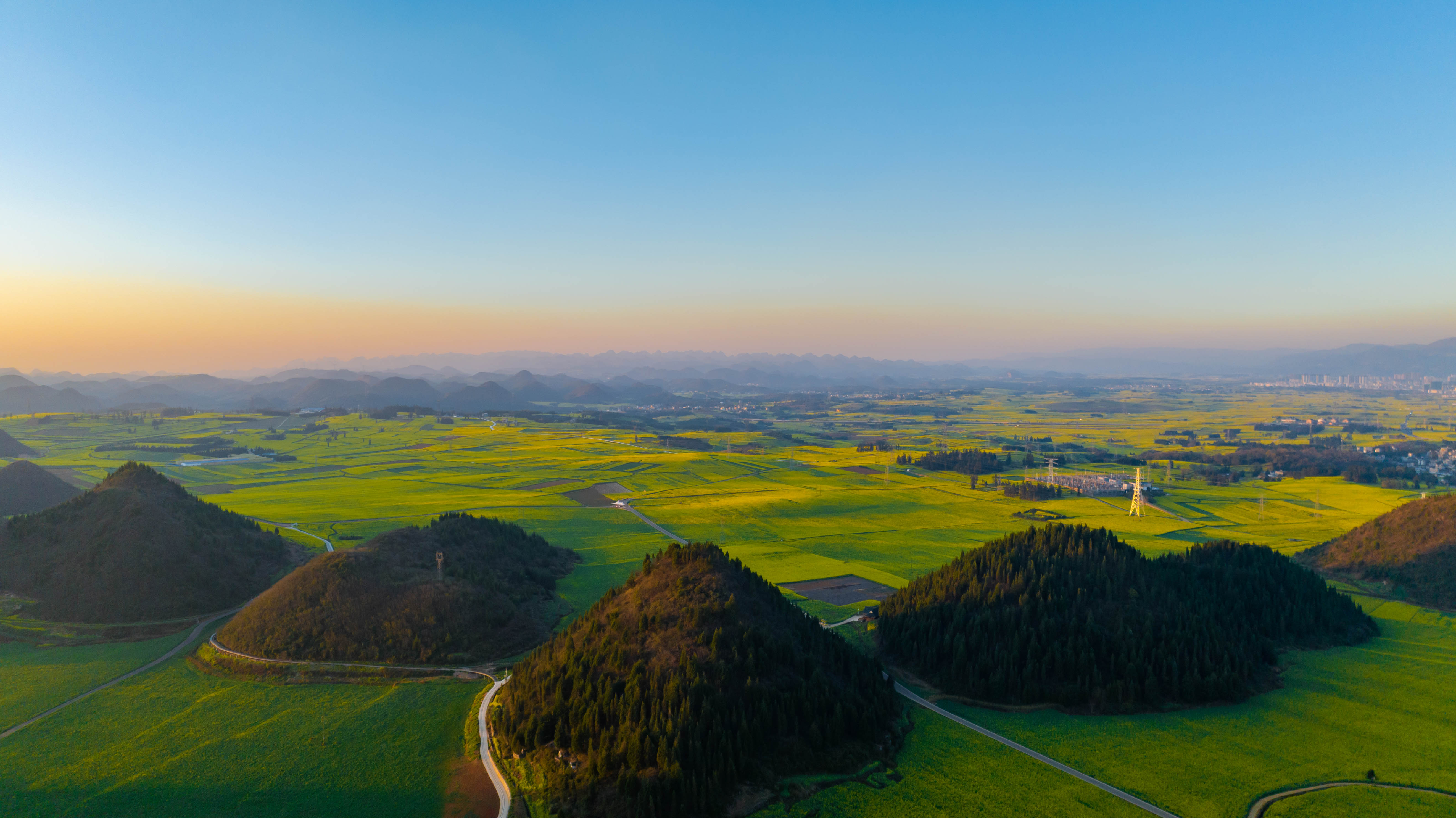 云南省罗平县金鸡峰丛油菜花海日出美景(2月19日摄,无人机照片)。新华社记者 胡超 摄
