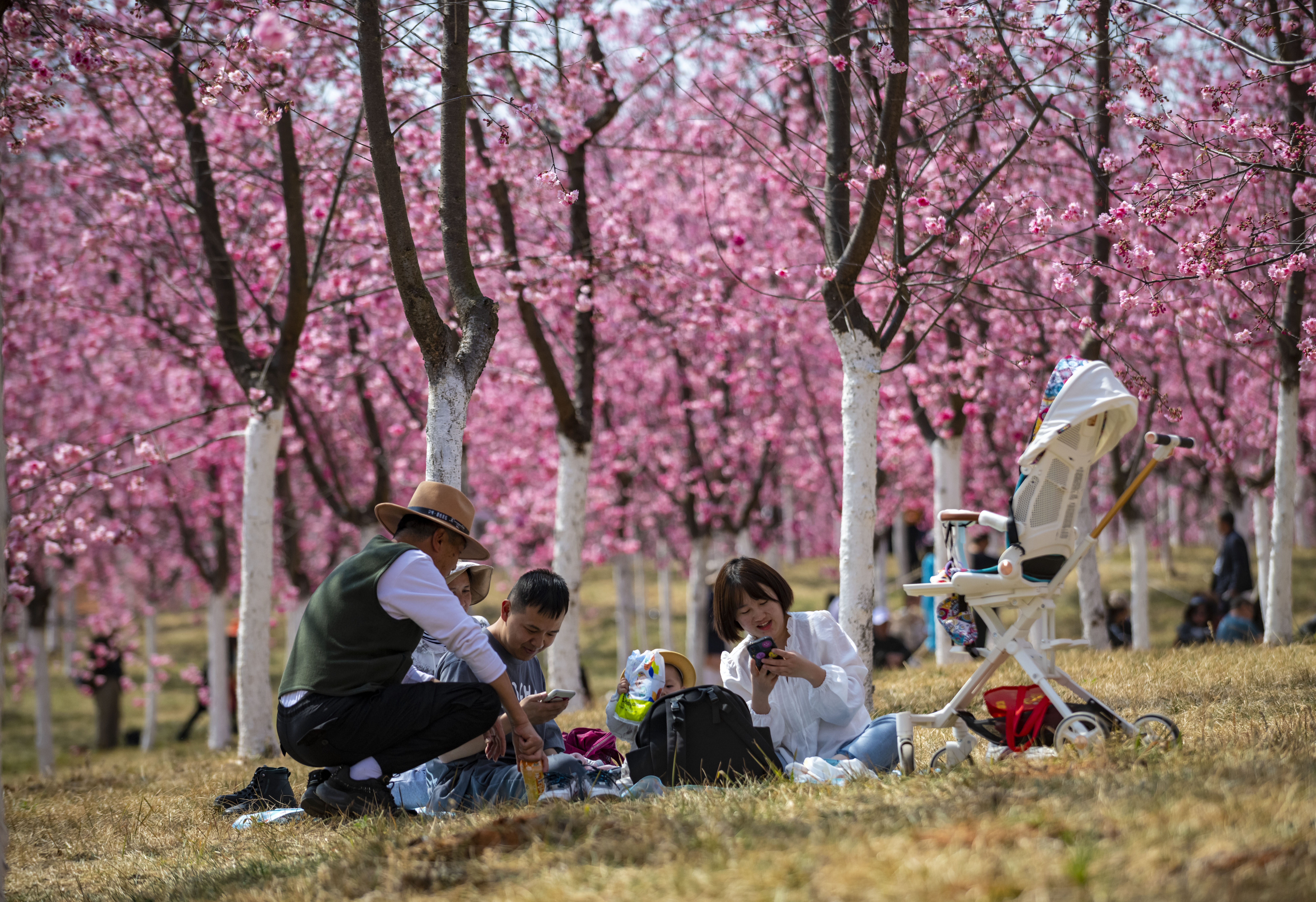 近日,北京市居庸关长城景区山桃花开,花海中的列车、长城上的游客与春景,勾勒出一幅幅美丽的画卷。新华社发(刘满仓摄)