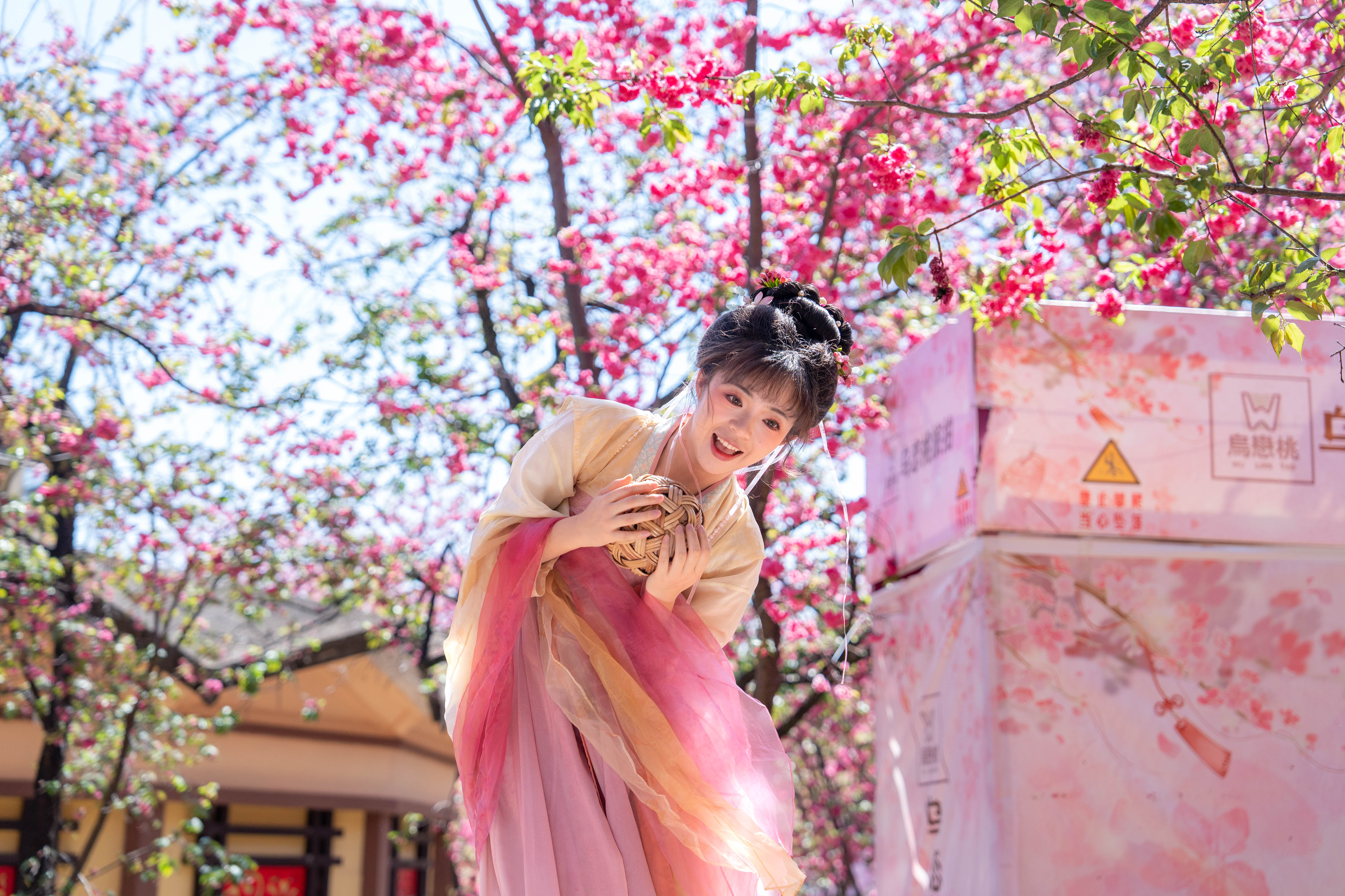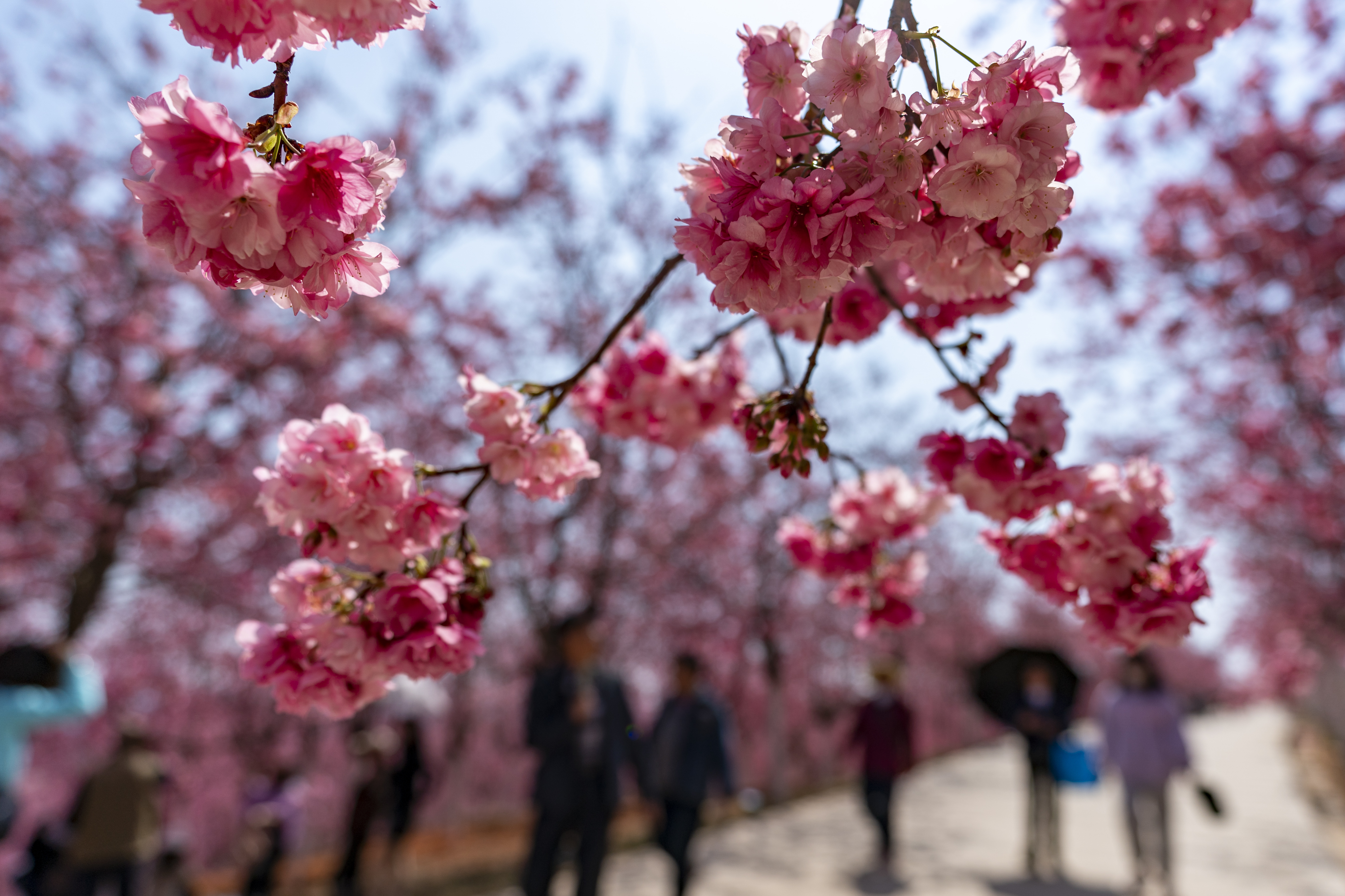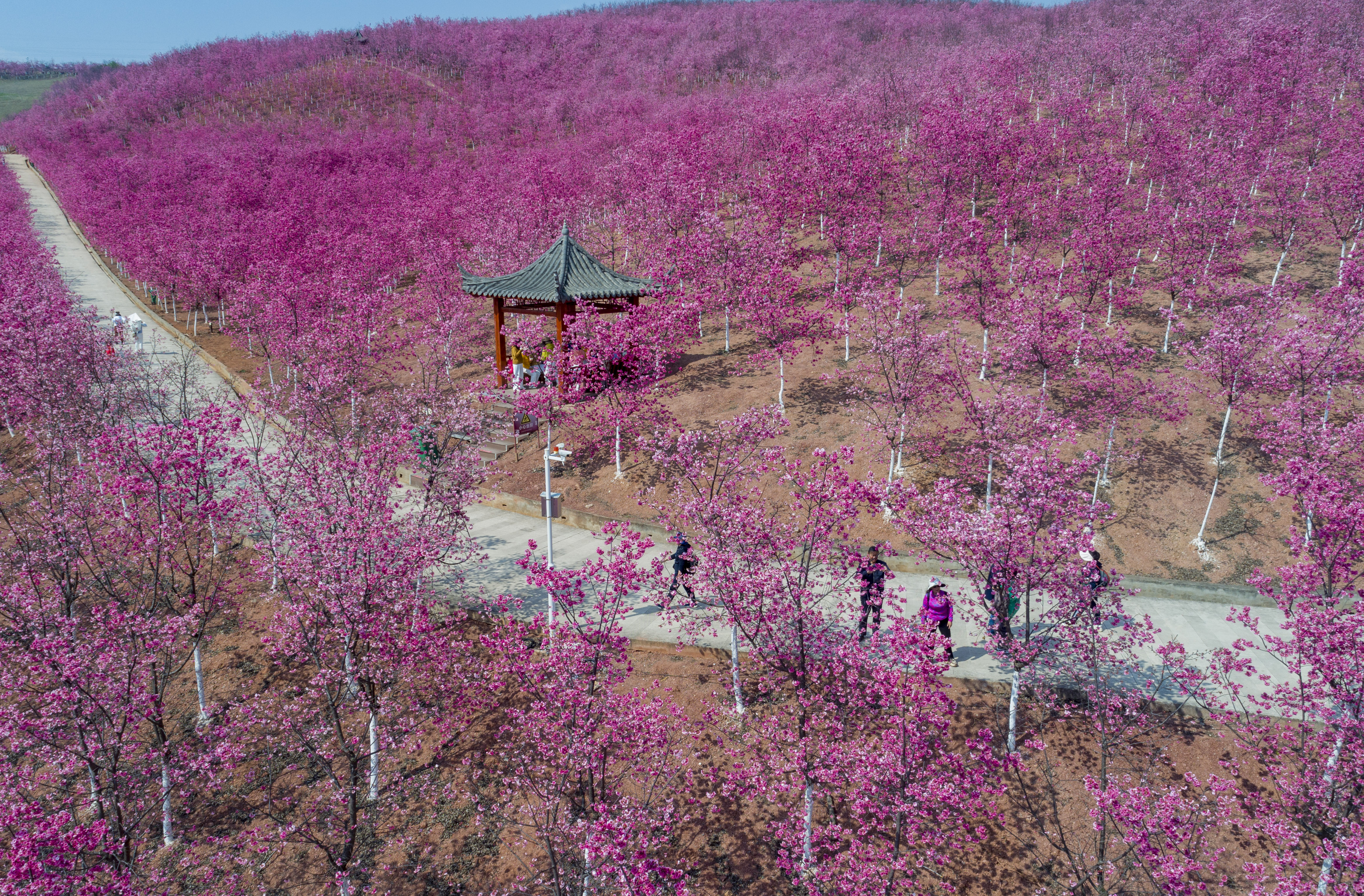 2023年3月1日,游客在宜良县山后樱花谷观光游览(无人机照片)。新华社记者 陈欣波 摄