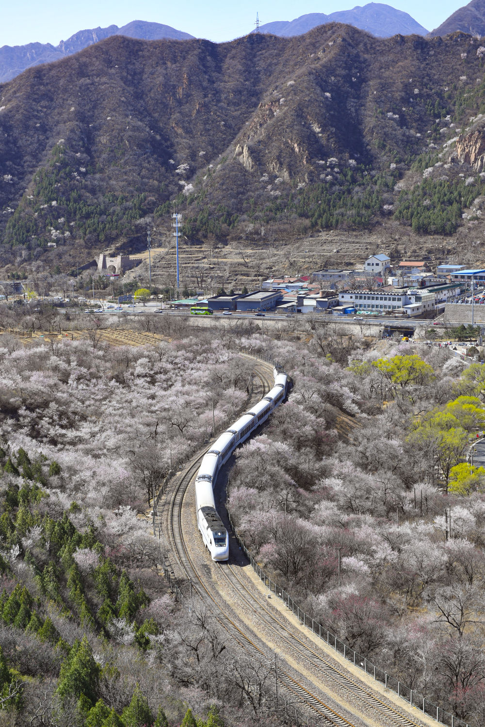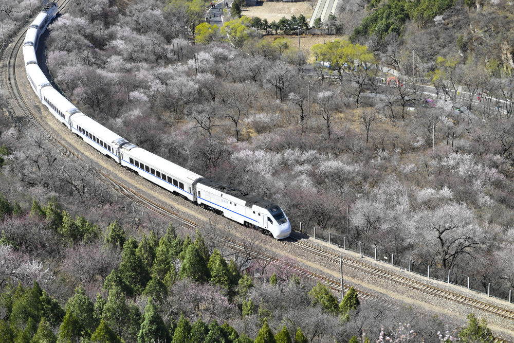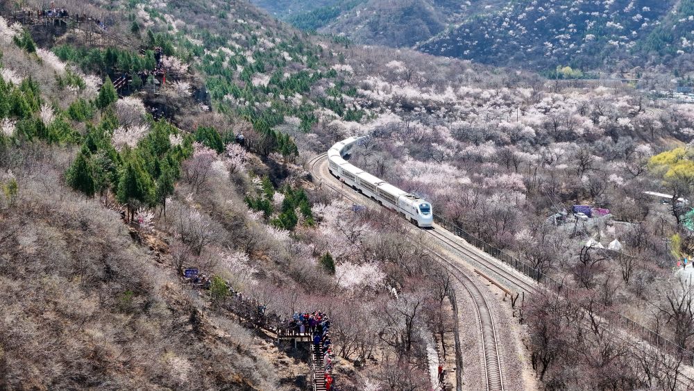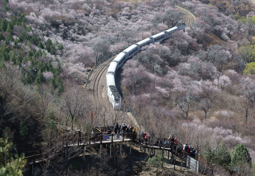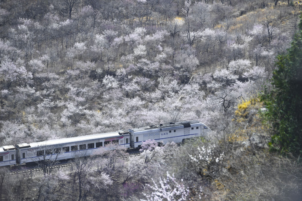近日,北京居庸关长城脚下的山花渐次开放。北京市郊铁路S2线列车穿行于花海间,成为春日里一道美丽的风景,吸引不少游人前来赏春。