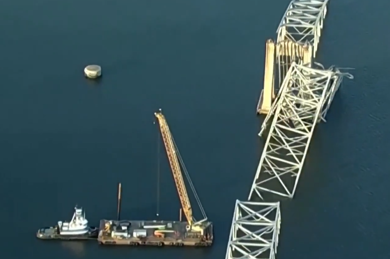 美国被撞大桥事故现场:起重机已就位 将于30日吊起水中桥体